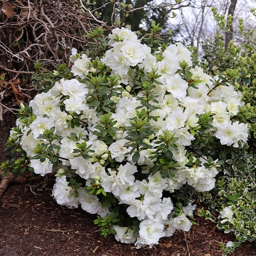 Charakteristika: Azalka japonská ´PERFECTO MUNDO®DOUBLE WHITE´ je nová unikátní opakovaně kvetoucí odrůda. Patří do série ´Perfecto Mundo®´, která je známá bohatým a dlouhotrvajícím kvetením během několika měsíců v roce. Na jaře kvete velkými poloplnými květy bílé barvy, kterými je keř doslova obsypán. Po krátkém období klidu následuje další vlna kvetení, a to od poloviny léta až do podzimu. Listy jsou tmavě zelené, lesklé a eliptické, čímž vytvářejí krásné pozadí pro květiny. Vytváří kompaktní, kulovitý keř, který obvykle dosahuje výšky 75 až 90 cm. Výborně se hodí do skupinových výsadeb, na okraje záhonů, jako nízký živý plot, ale také na pěstování v nádobách na terasách či balkonech.