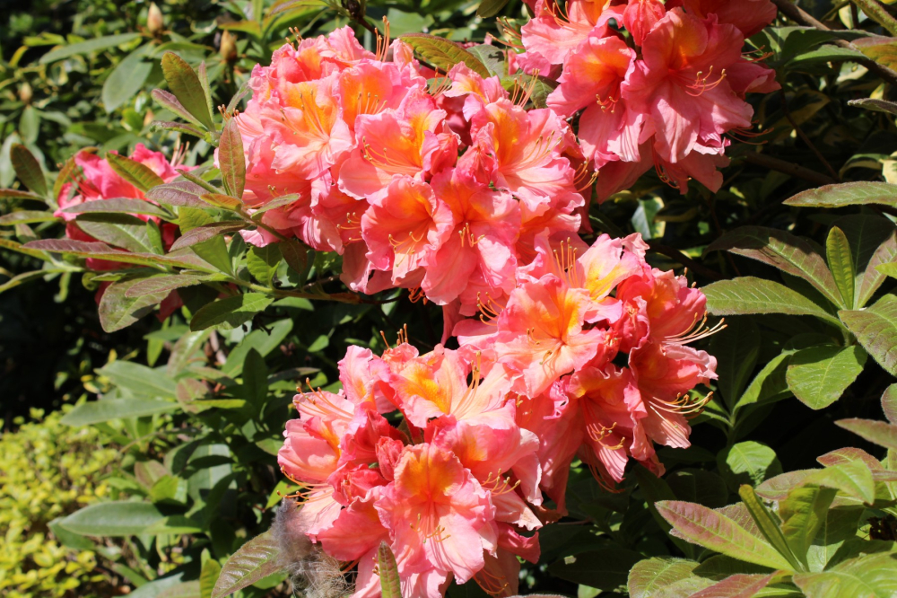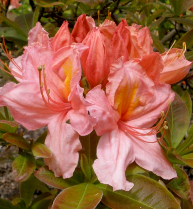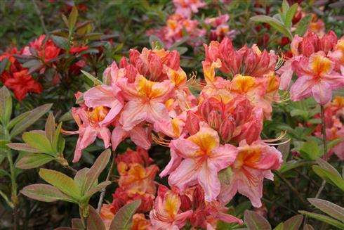 Opadavá azalka s velkými, výrazně voňavými růžovými květy se žlutou kresbou.