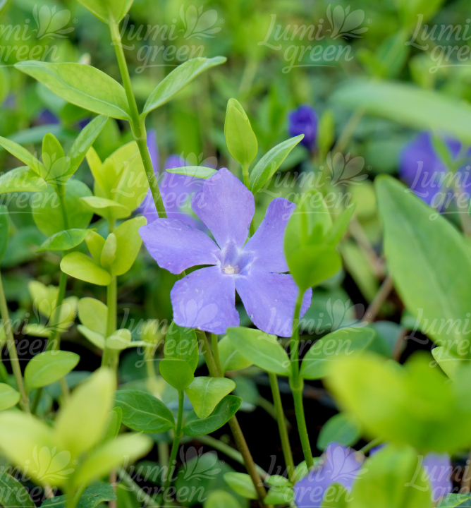 Charakteristika: Oblíbená vždyzelená půdopokryvná trvalka, která se může použít i jako náhrada trávníku ve stínu. Vytváří menší zelené, kožovité, lesklé listy, které zpestří fialově modré pětičetné květy s plochými okvětními okvětními lístky.
