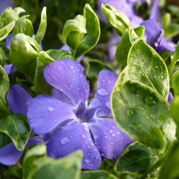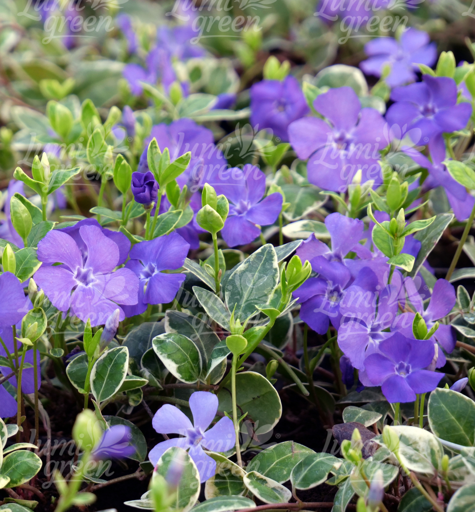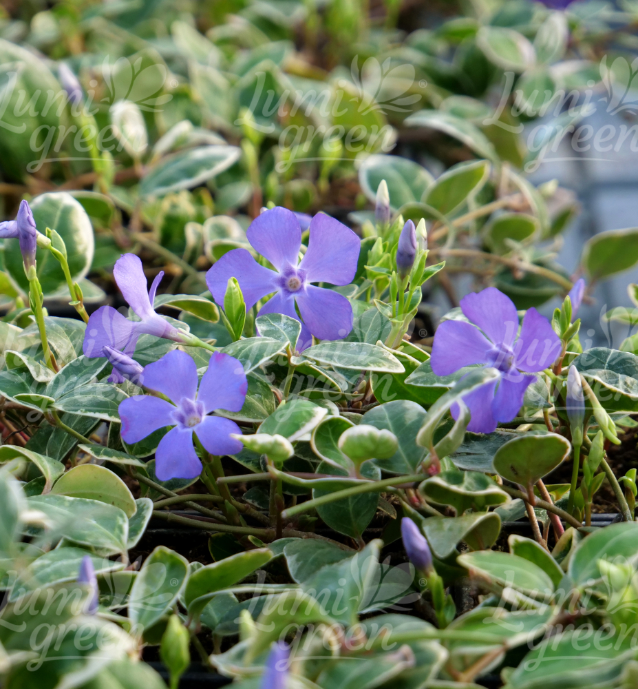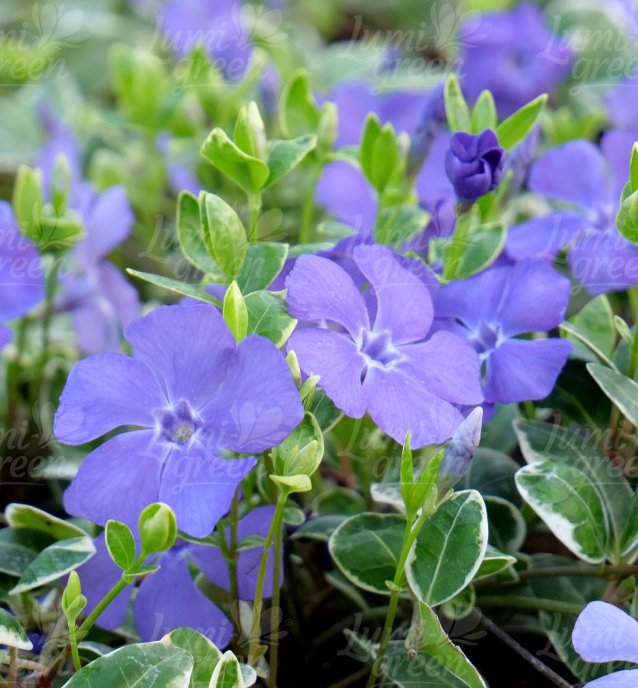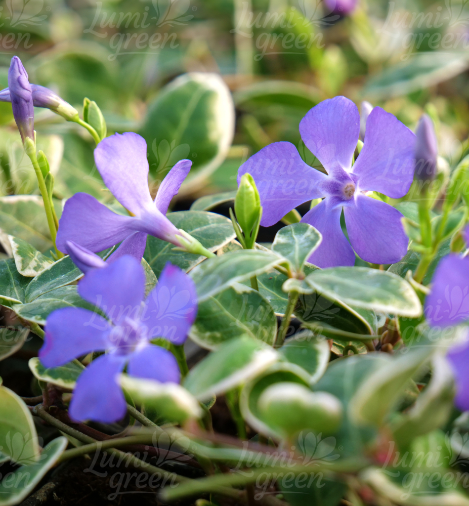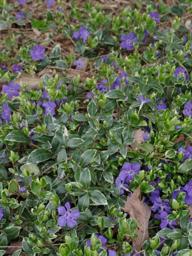 Vždyzelený barvínek s bílo zelenými listy a fialovomodrými květy.