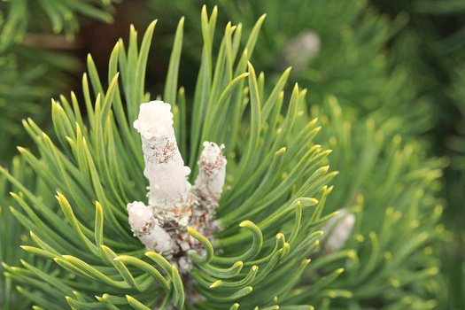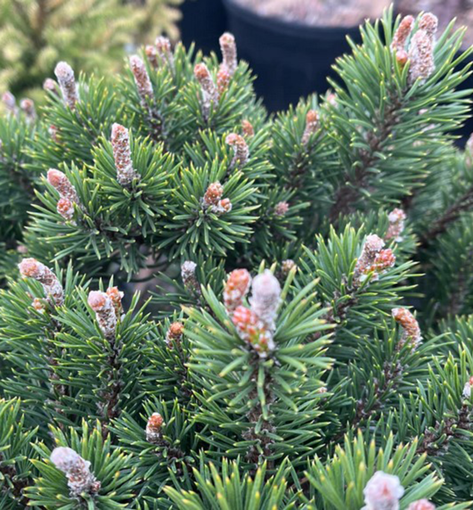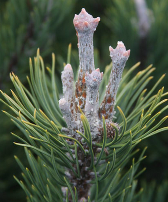 Kompaktní borovice s hustým kulovitým vzrůstem a stříbřitými pupenmi.