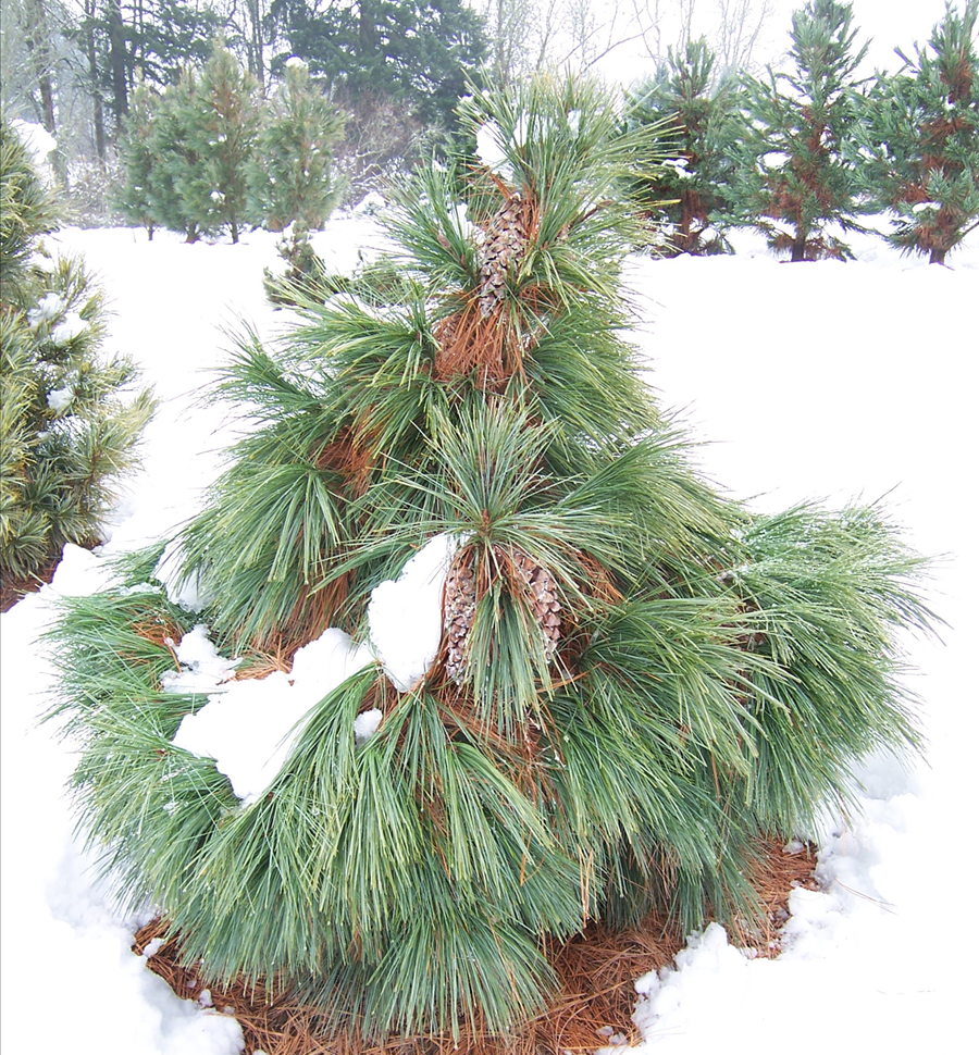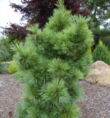 Jedinečná pyramidální borovice s hustými svazky měkkých dlouhých jehlic.