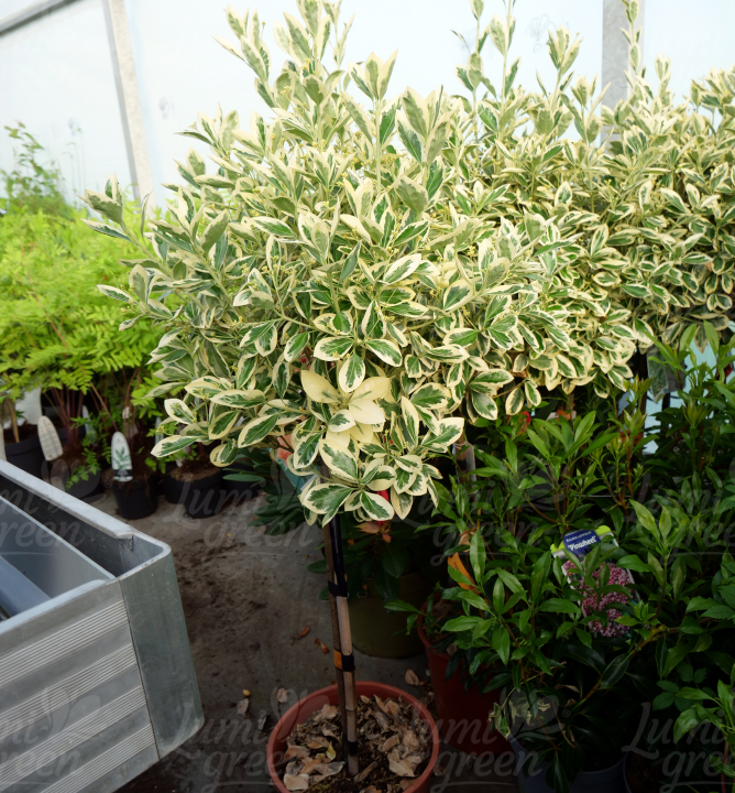 Nový atraktivní stálezelený brslen na kmínku s nápadně panašovanými listy.