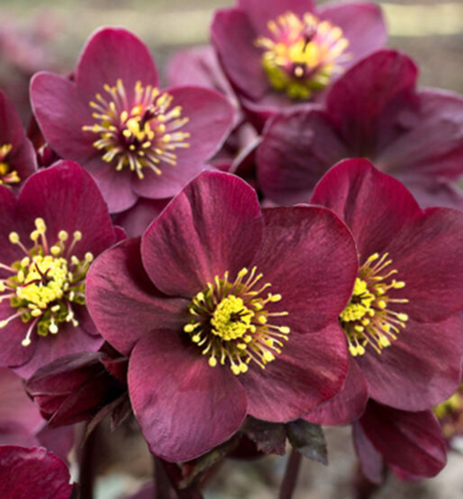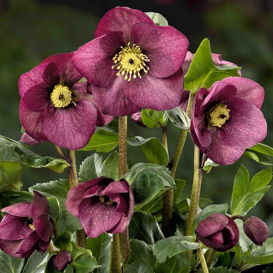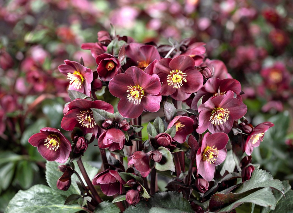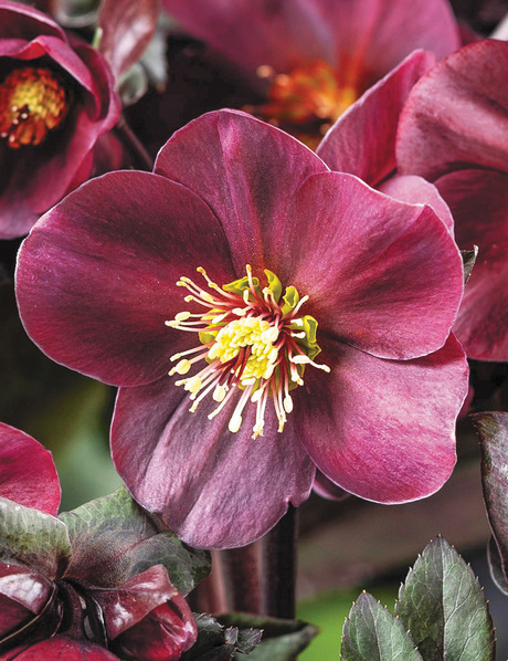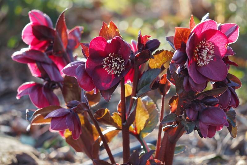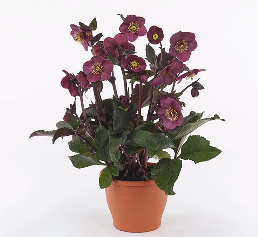 Výrazná zimní trvaka s tmavými vínově červenými květy.
