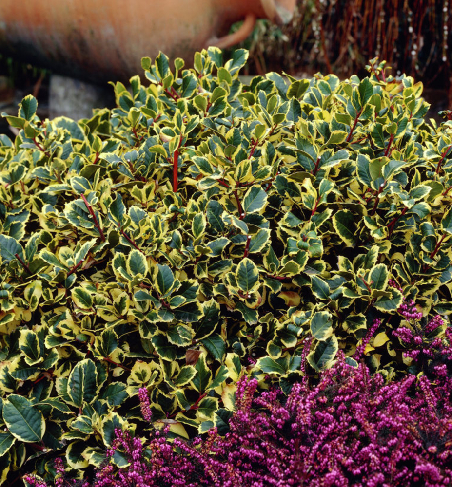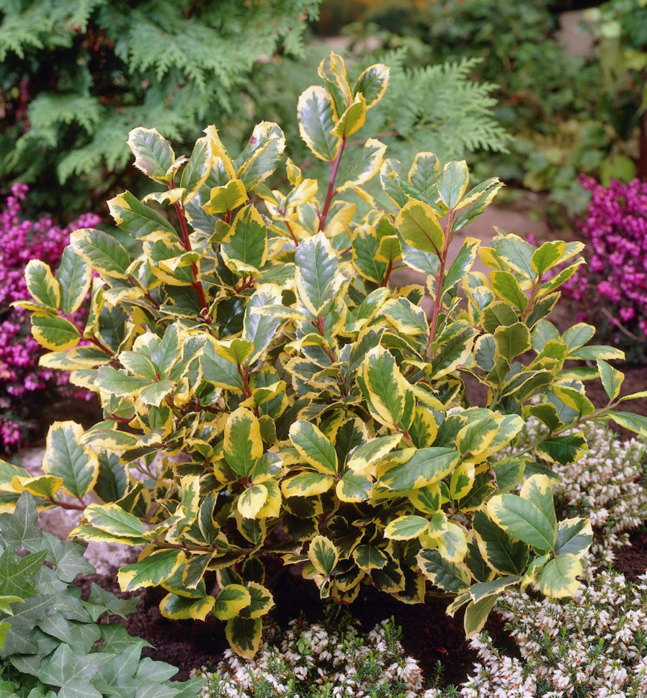 Stálezelená samičí cesmína se zelenými listy a výraznou zlato žlutou kresbou.