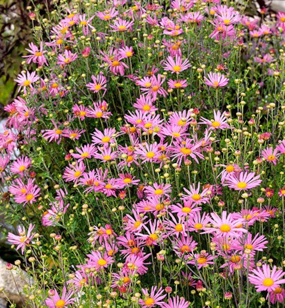 Bohatě kvetoucí podzimní trvalka se světle růžovými květy a žlutými středy.