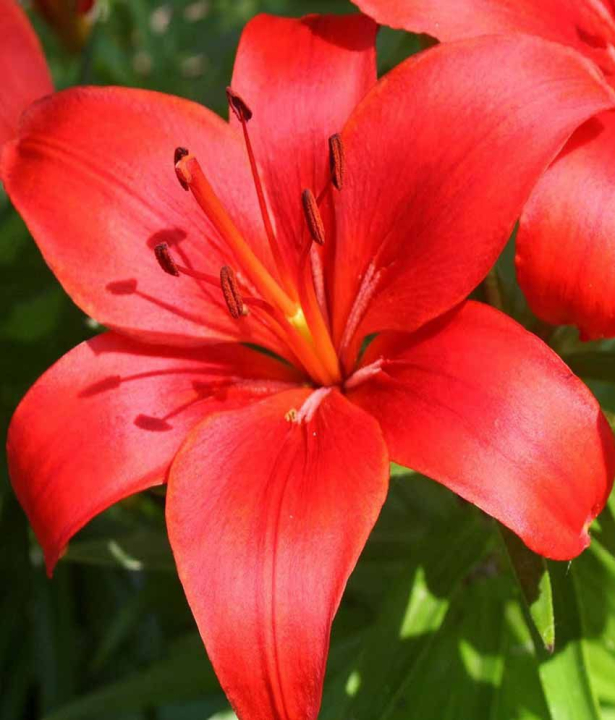 Charakteristika: Lilie'Asiatic Red' vyniká velkými oranžově červenými květy. Květiny rostou na vzpřímených olistěných stoncích a mohou mít průměr až 20 cm. Listy jsou tmavozelené, kopinaté. Lilie roste velmi kompaktně a hodí se na pěstování jako půvabný solitér, ale také jako dominanta trvalkových záhonů.