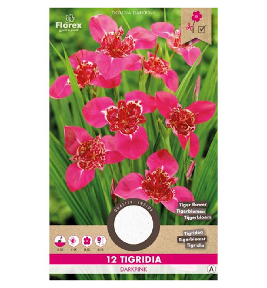 Charakteristika: Tigridia také nazývaná i 'Kvet tigra' kvůli tygří skvrnám, které květ má. Původem je ze Střední Ameriky (Mexiko, Guatemala) a Jižní Ameriky (Ekvádor, Peru a Bolívie). Tigridia má na každý stonek několik květin, které kvetou pouze několik dní. Ale protože každá rostlina produkuje dostatek stonků, období kvetení ve skutečnosti trvá několik týdnů. Trojúhelníkové květiny poutají pozornost fialovými až fuchsiová odstíny. Otevírají se ráno za úsvitu a zavírají za soumraku. Listy Tigridie připomínají listy duhovky nebo mečíku.