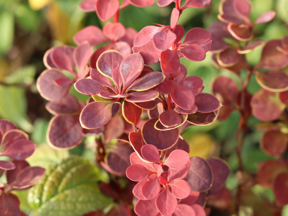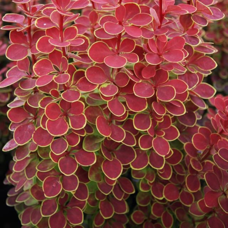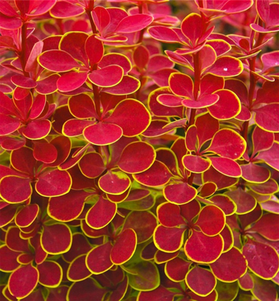 Vzpřímeně rostoucí dřišťál s oranžově červenými listy a zlatým okrajem.