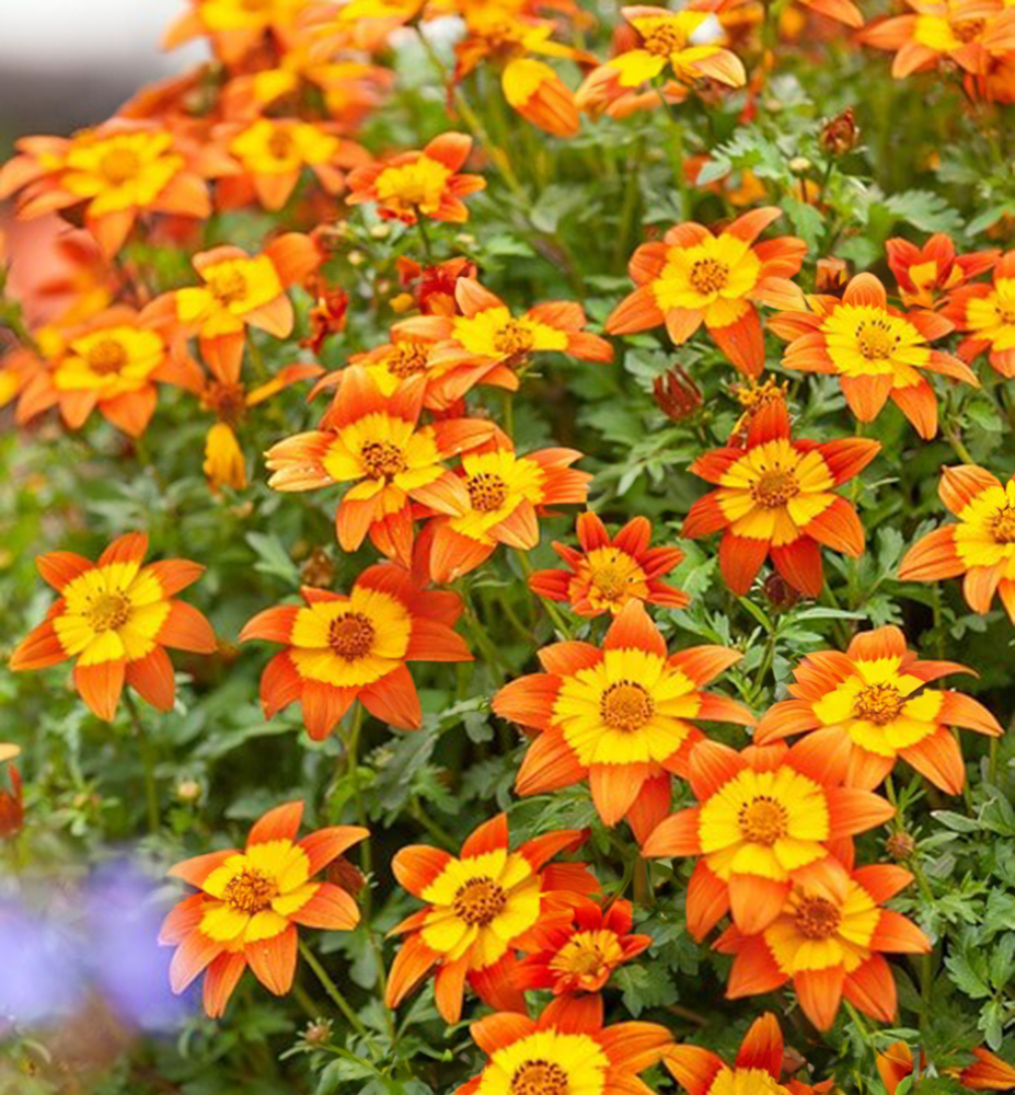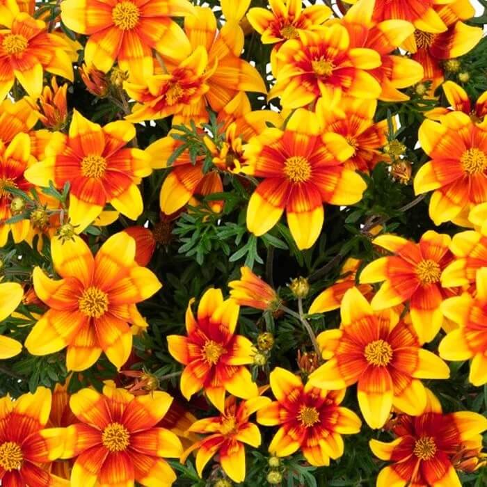 Charakteristika: Dvouzubec ´BIDY BOOM FIRESIDE´ zaujme svými dvoubarevnými květy oranžově žluté barvy. Kvete spolehlivě a bohatě po celou sezónu. Květy jsou atraktivní pro včely a motýly. Listy jsou svěže zelené a hluboce vykrojené, čímž dodávají rostlině jemný a atraktivní vzhled. Rostlina má kompaktní polopřevislý vzrůst, díky čemuž je ideální jako výplňová letnička. Dvouzubec je v posledních letech velmi oblíbená letnička do truhlíků a závěsných nádob. Je odolný i vůči nižším teplotám.