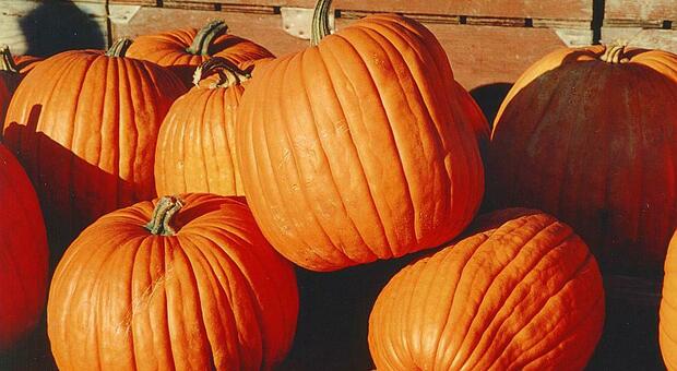 Dýně s tmavě oranžovými plody, výbornými pro vyřezávání halloweenských dekorací.