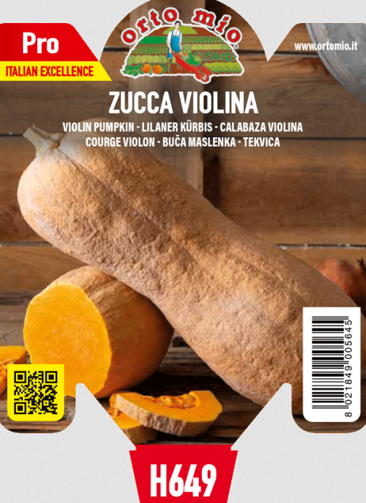 Charakteristika: Dýně ´VIOLINA´ je tradiční kultivar pěstovaný hlavně v okolí Ferrary. Název má podle tvaru plodu, který je velmi podobný houslím. Jeho hlavní charakteristikou jsou podlouhlé plody se zvrásněnou žlutooříškovou slupkou a oranžovou máslovou dužninou. Mohou vážit přibližně 4 kg. Mají skvělou chuť, díky čemuž se využívají k přípravě krémových polévek, na pečení, grilování, rizota a dezerty.
