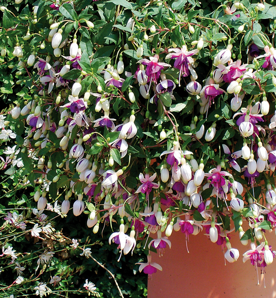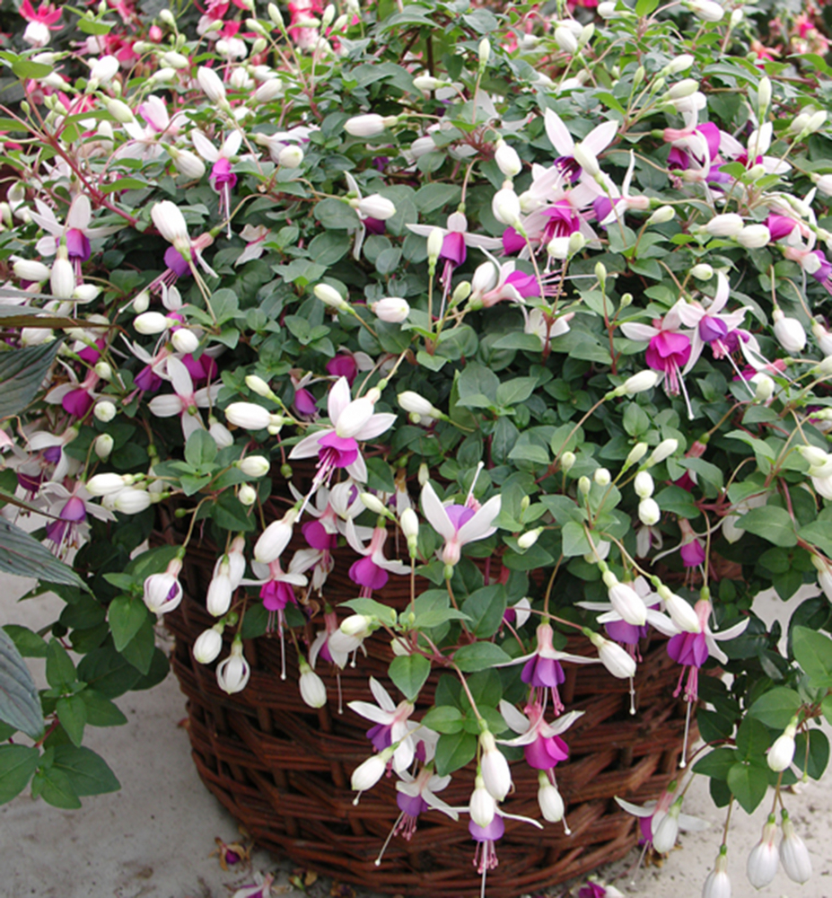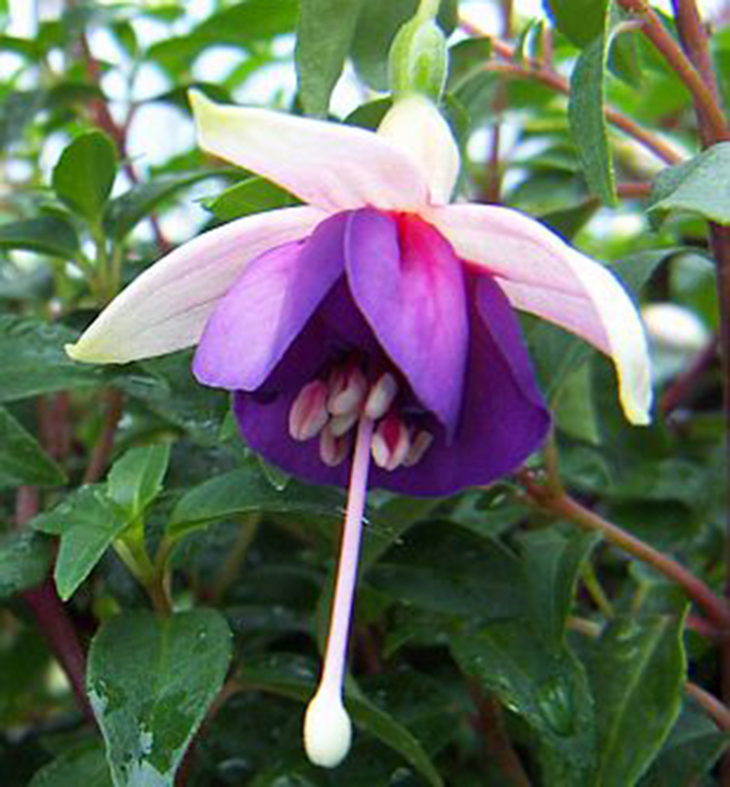 Čarokrásná fuksia s bílo-fialovými květy připomínající tanečnice v sukýnkách.