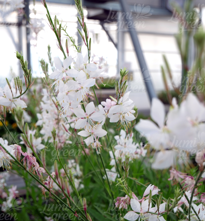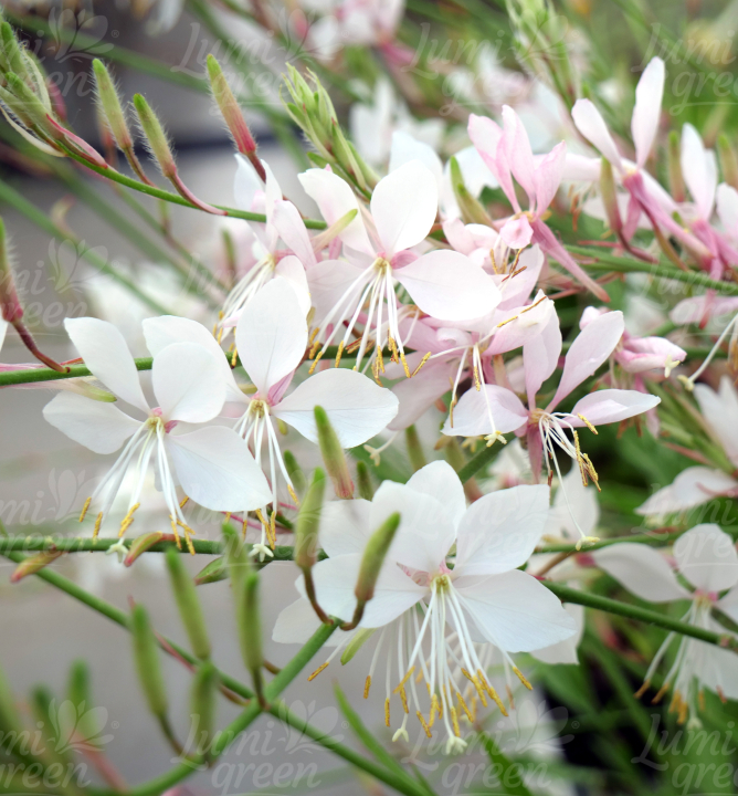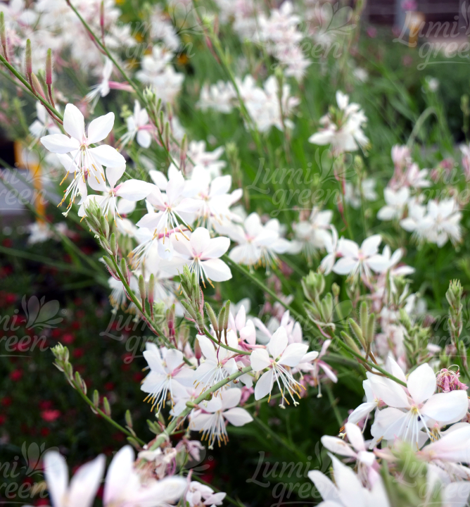 Charakteristika: Gaura Lindheimerova patří mezi bohatě kvetoucí rostliny, které vytvářejí během léta na vzpřímených stoncích malé bílé květy, připomínající motýlí křídla. Květy se rozvíjejí z bledě růžových poupat, čímž vytvářejí na rostlině elegantní barevnou kombinaci. Vytváří kompaktní trsy s podlouhlými listy svěží zelené barvy. Rostlina je vhodná na výsadbu do skalek, na okraje chodníků nebo do květináčů.