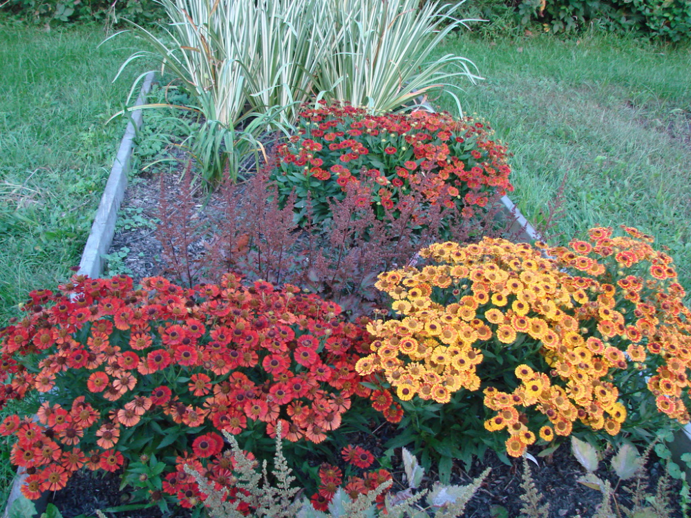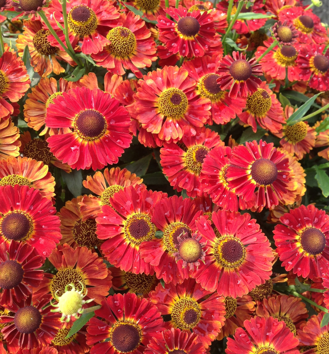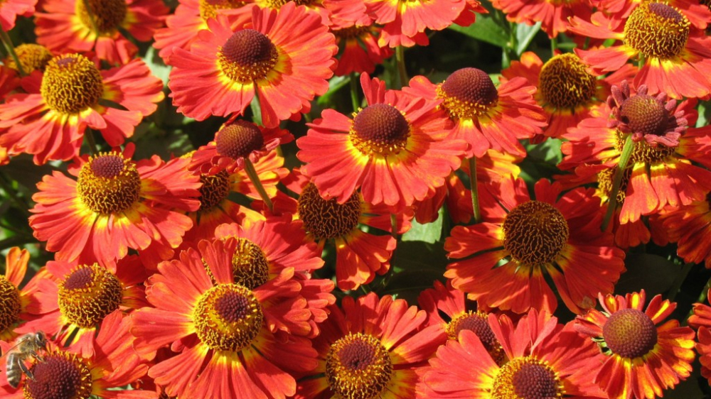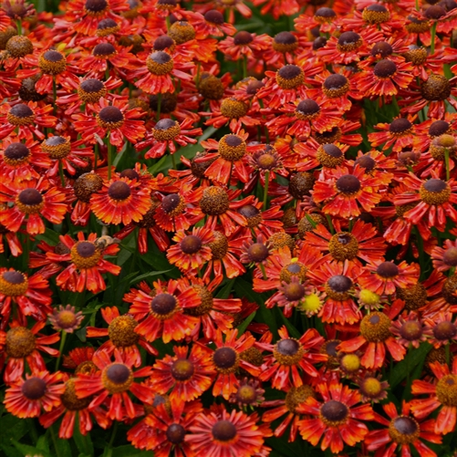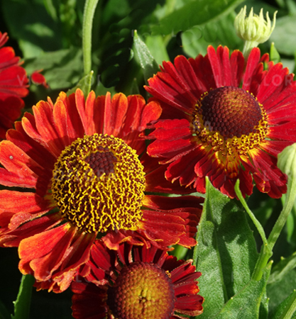 Podzimní helenium se zářivými červenými květy s hnědým středem.