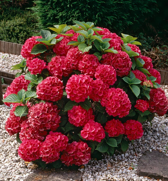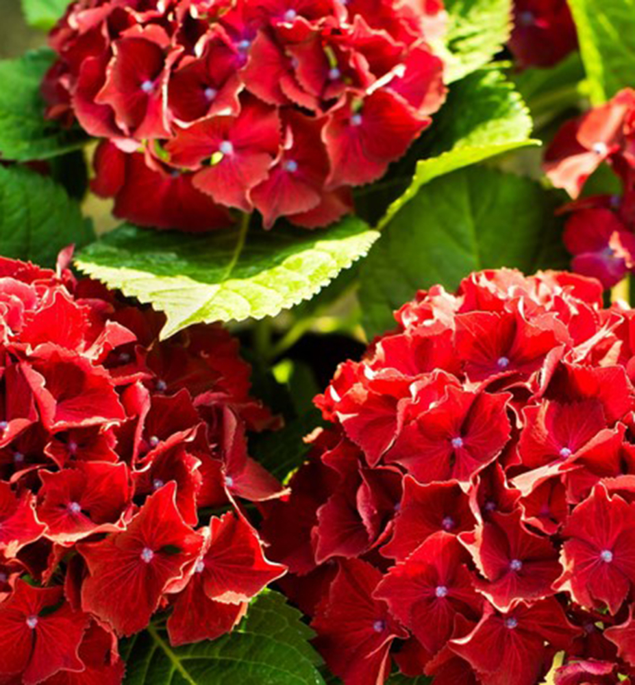 Kompaktní, nízký kultivar hortenzie s výraznými červenými květenstvími.