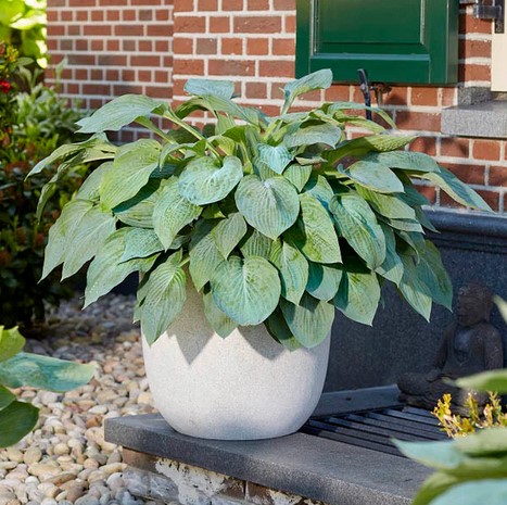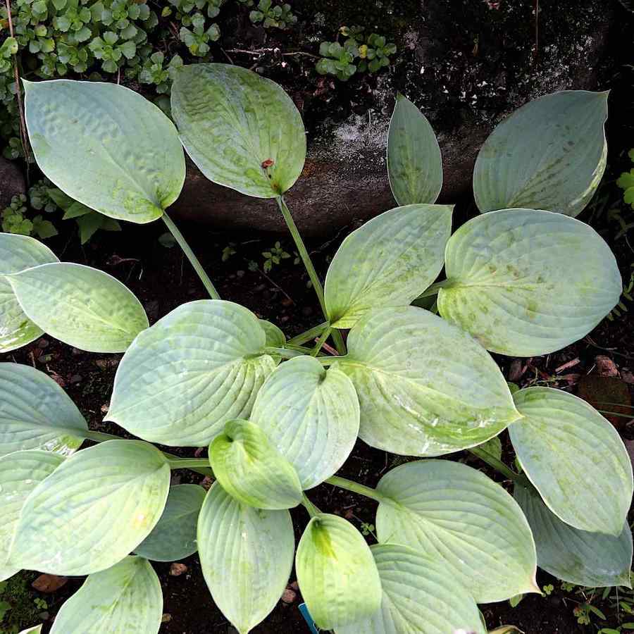 Středně velká hosta s modrozelenými listy, vytvářející kompaktní trs.