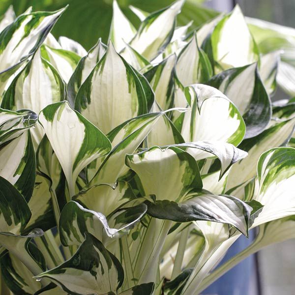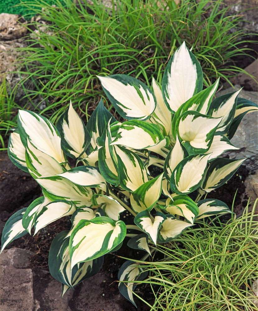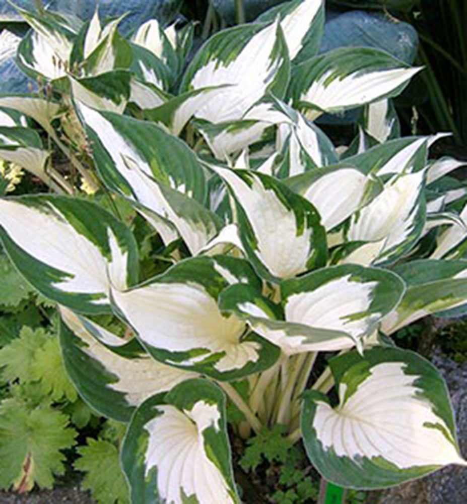 Hosta "Led a oheň" s kontrastně zbarvenými listy s ledově bílou kresbou ve tvaru plamene.