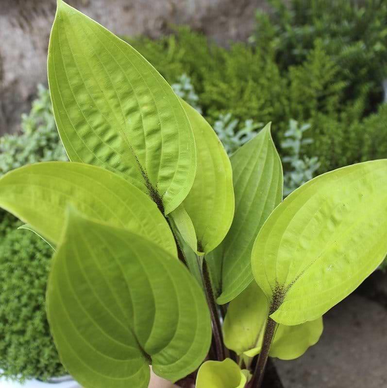 Výrazně zbarvená hosta se zlatožlutými listy a červenými stonky.