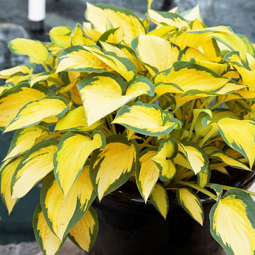 Exkluzivní hosta s výraznými žluto-oranžovými listy se zeleným okrajem.