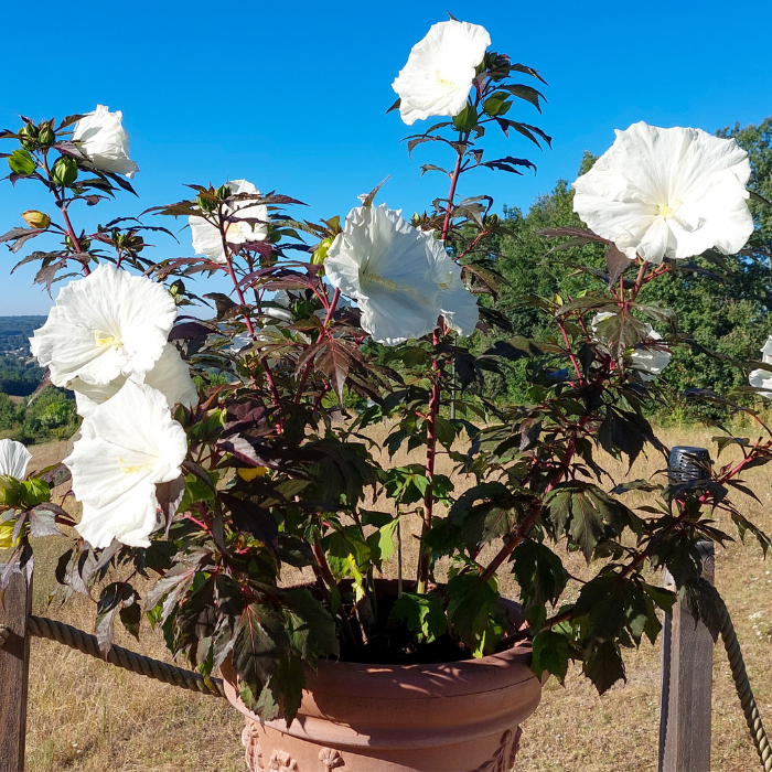 Atraktivní ibišek s velkými působivými květy perlově bílé barvy.