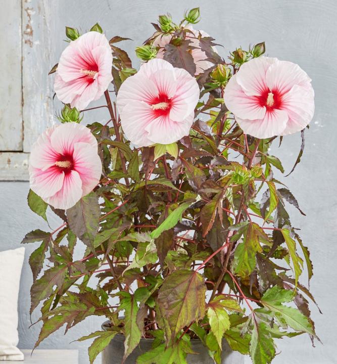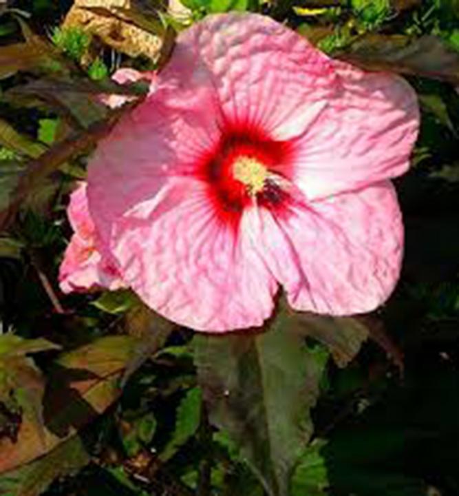 Nepřehlédnutelný ibišek s výraznými velkými květy růžové barvy.