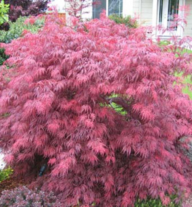 Okouzlující nižší javor kompaktního tvaru s vínově-červenými listy.