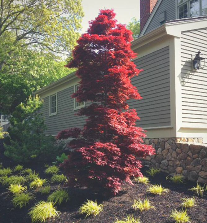 Charakteristika: Javor dlaňovitolistý 'TWOMBLY'S RED SENTINEL' je výjimečný kultivar japonského javoru se štíhlým, úzce sloupovitým, vzpřímeným habitusem, který si zachovává kompaktní siluetu i v dospělosti. Roste pomalu a v průběhu let dosahuje přibližně 3–4 m výšky při šířce kolem 1–1,5 m, díky čemuž je vhodný i do menších zahrad, předzahrad. Listy jsou typicky dlaňovitě laločnaté, na jaře intenzivně červené, během vegetace přecházejí do tmavších vínově červených až purpurových odstínů a na podzim se vybarvují do zářivých karmínových tónů.
