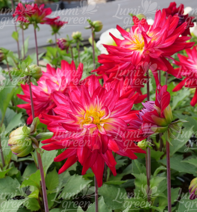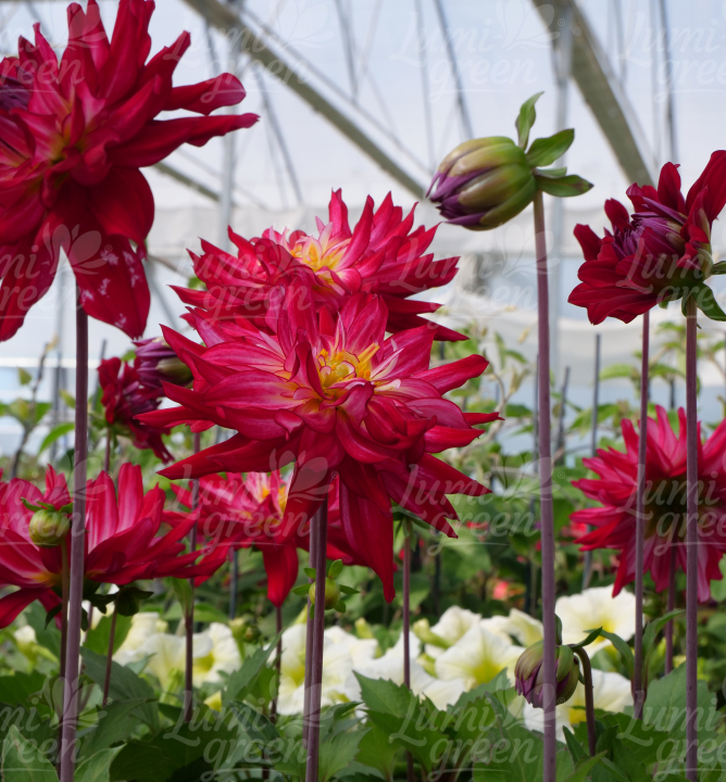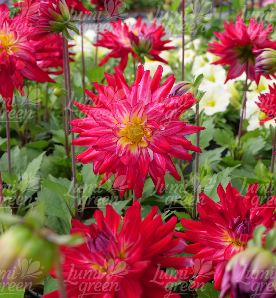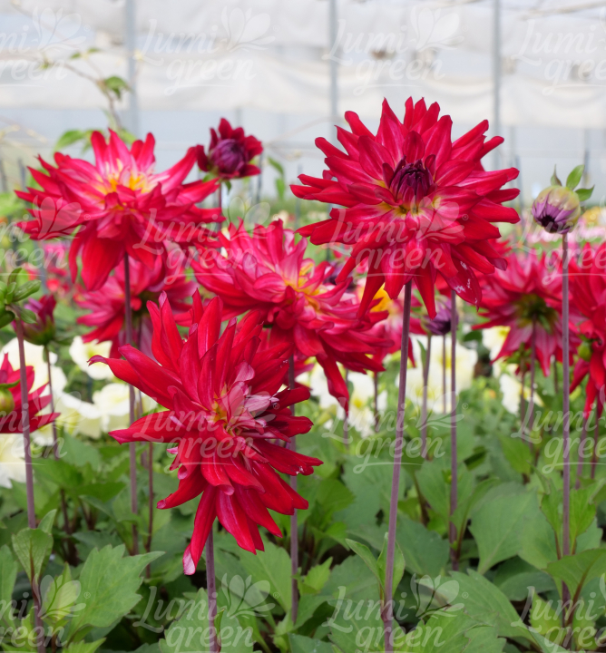 Charakteristika: Jiřina ´RASPBERRY ICE´ je odrůda s velmi velkými, plnými květy v syté malinově červené barvě. Kvete od léta až do prvních mrazů a květiny se tvoří na krátkých, pevných stoncích. Rostlina dorůstá výšky přibližně 40cm, díky čemuž je ideální pro pěstování v nádobách, ale i v záhonech či samostatně nebo ve skupinových výsadbách. Listy jsou tmavozelené, mírně lesklé, pérovité se zoubkovanými okraji, což dodává rostlině bohatý a dekorativní vzhled.