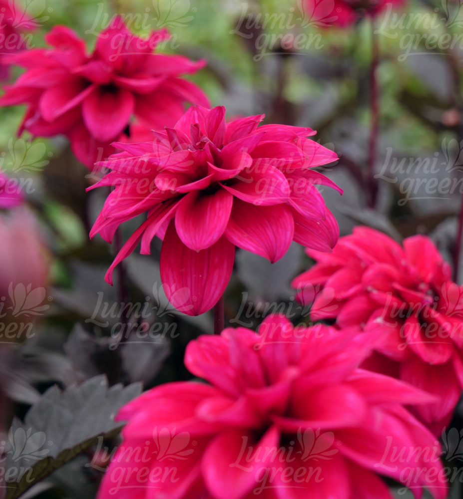 Elegantní jiřina s plnými fuchsiovými květy a listy v tmavých odstínech.