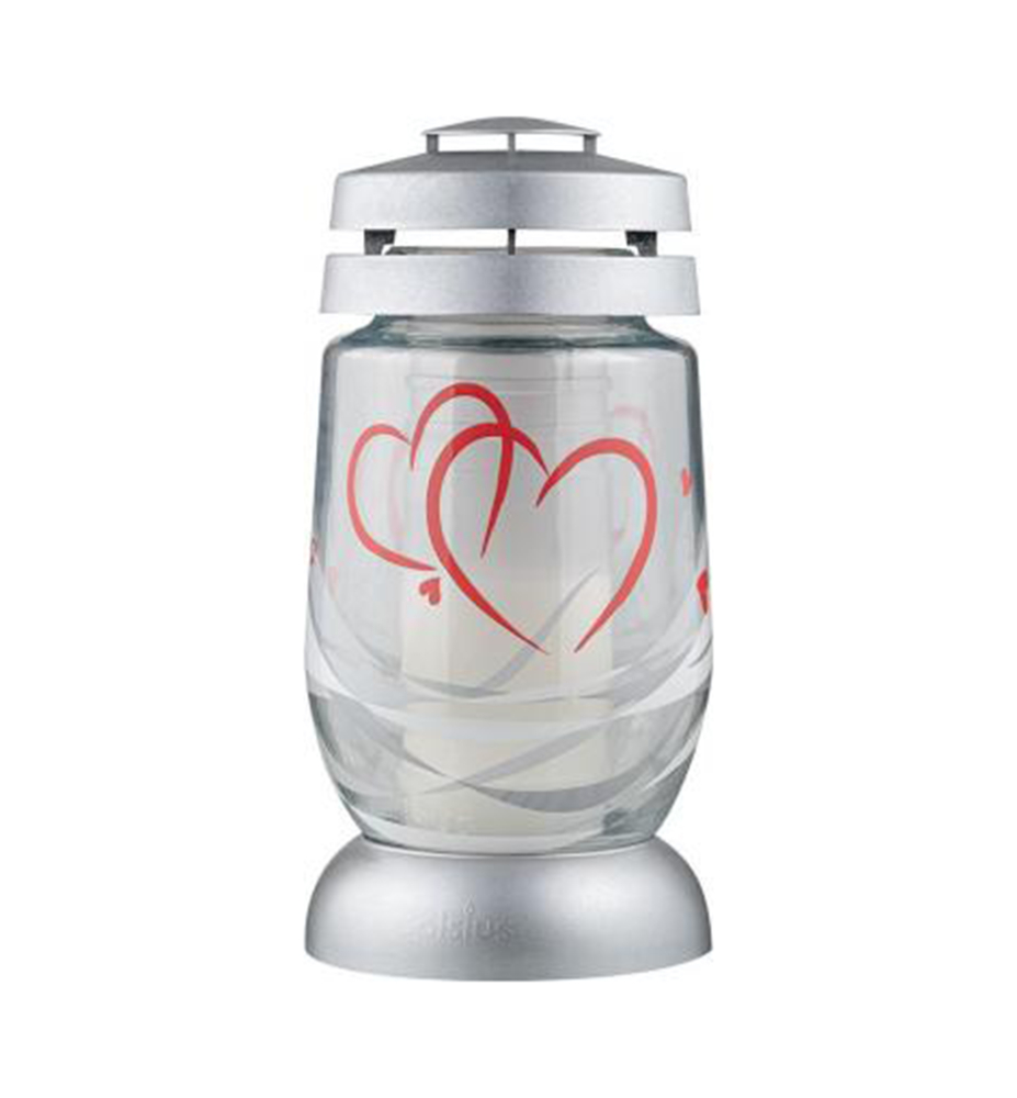 Charakteristika: Kahanec se stříbrnými akcenty je vyroben z kvalitního průhledného skla, přes které je krásně vidět plamen. Díky velké základně je velmi stabilní a díky speciální struktuře a "čepici" je vložka uvnitř dokonale chráněna proti větru a vodě. Elegantní a moderní, vypadá skvěle jako hlavní dekorace náhrobních kamenů. Kahanec obsahuje náplň s dobou hoření 36 hodin.