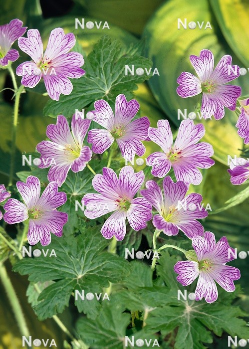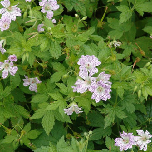 Původní půdopokryvný druh kakostu s bílými květy a růžovou kresbou.