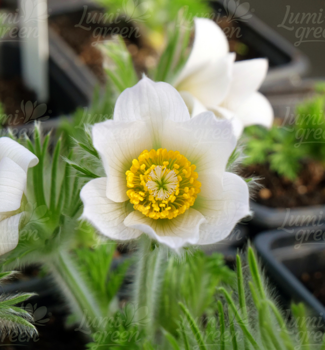 Půvabný koniklec s jemnými bílými květy, vhodný pro výsadbu do skalky.