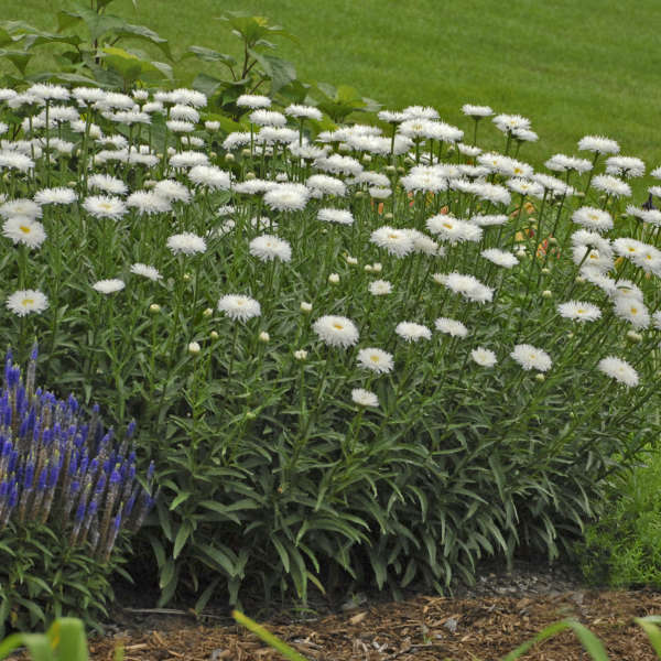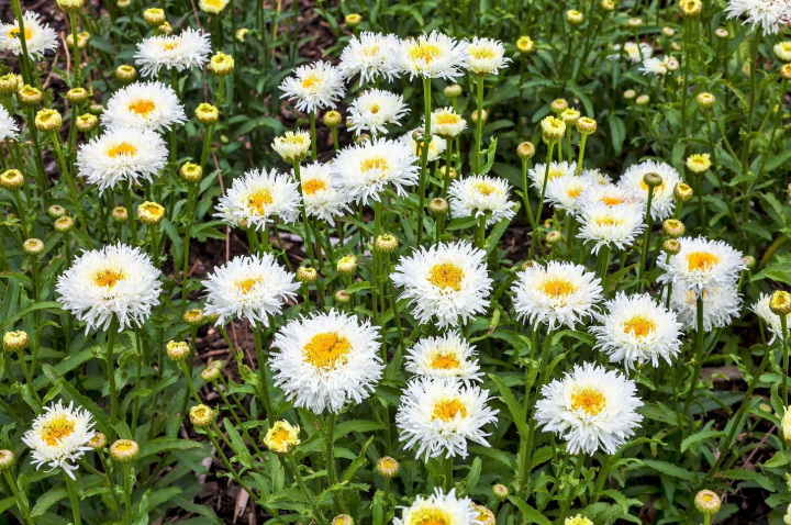 Bohatě kvetoucí, vyšší kopretina s jemnými, rozcuchanými květy.