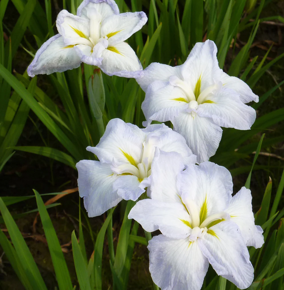 Japonský kosatec s elegantními zploštělými květy sněhobílé barvy.