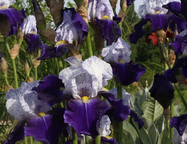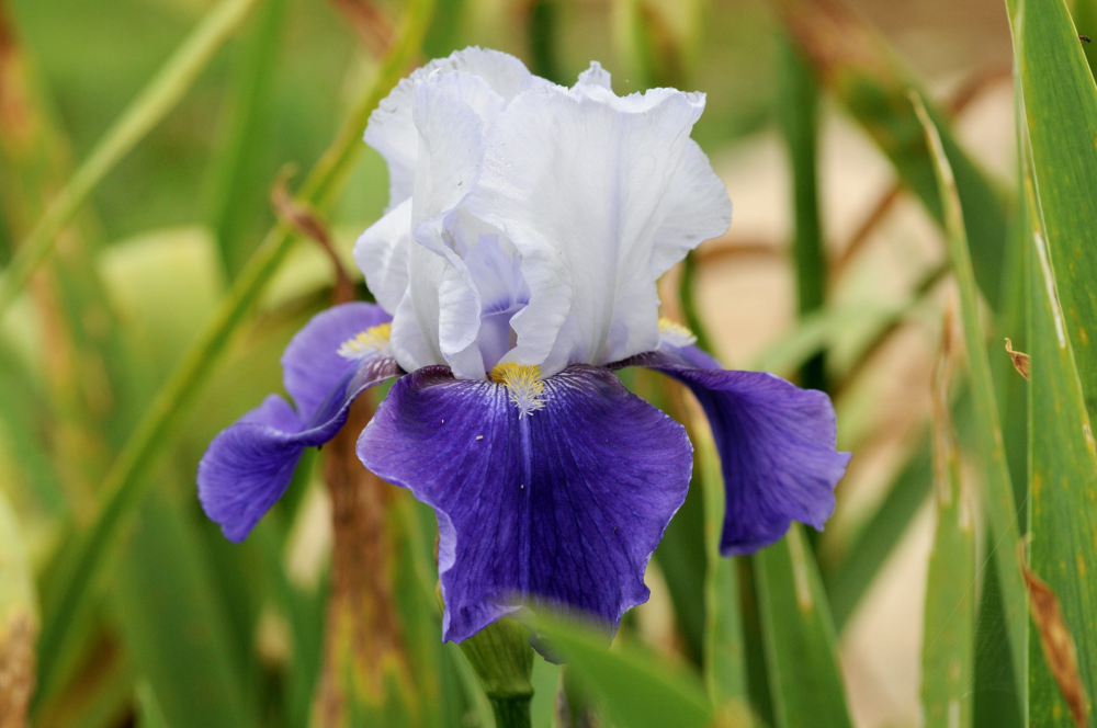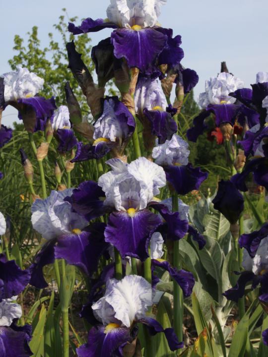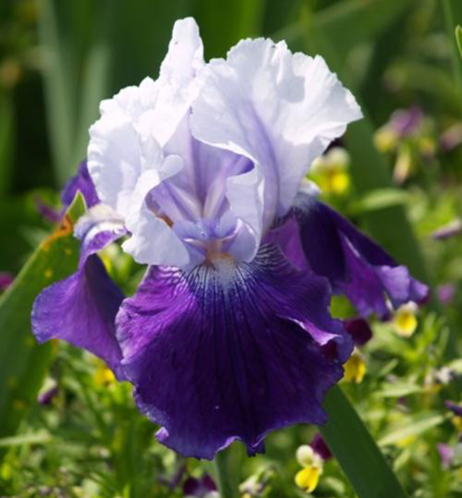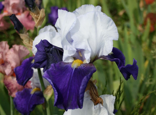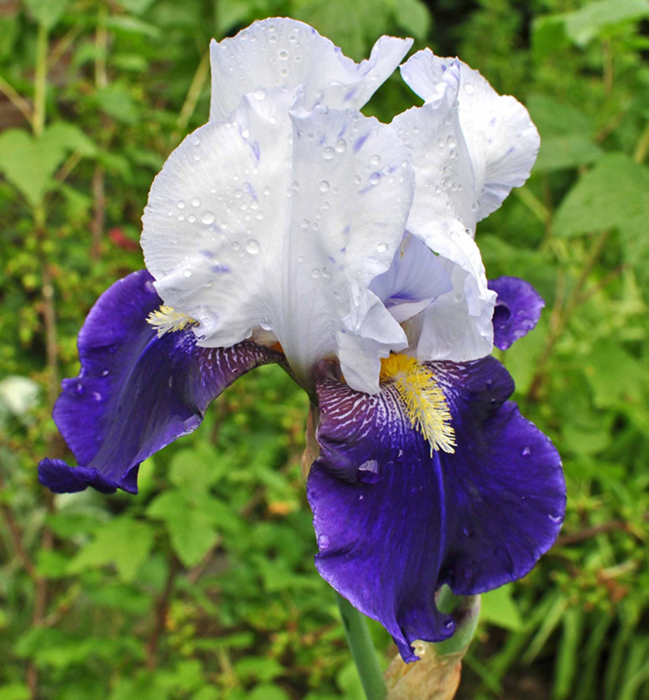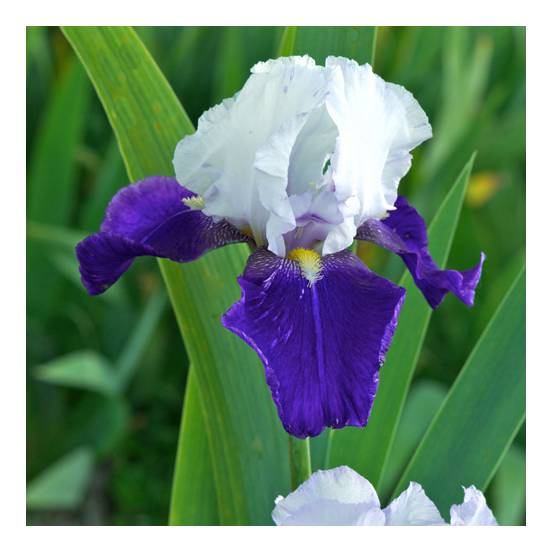 Působivý dvoubarevný kosatec s kontrastními okvětními lístky bílé a sametové modrofialové barvy.