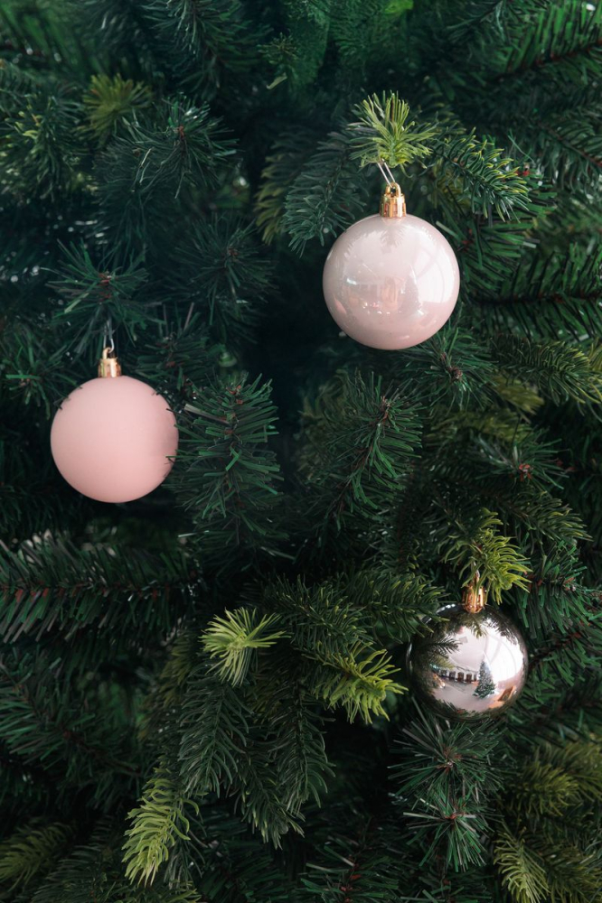 Sada vánočních ozdob v jemném růžovém odstínu.
