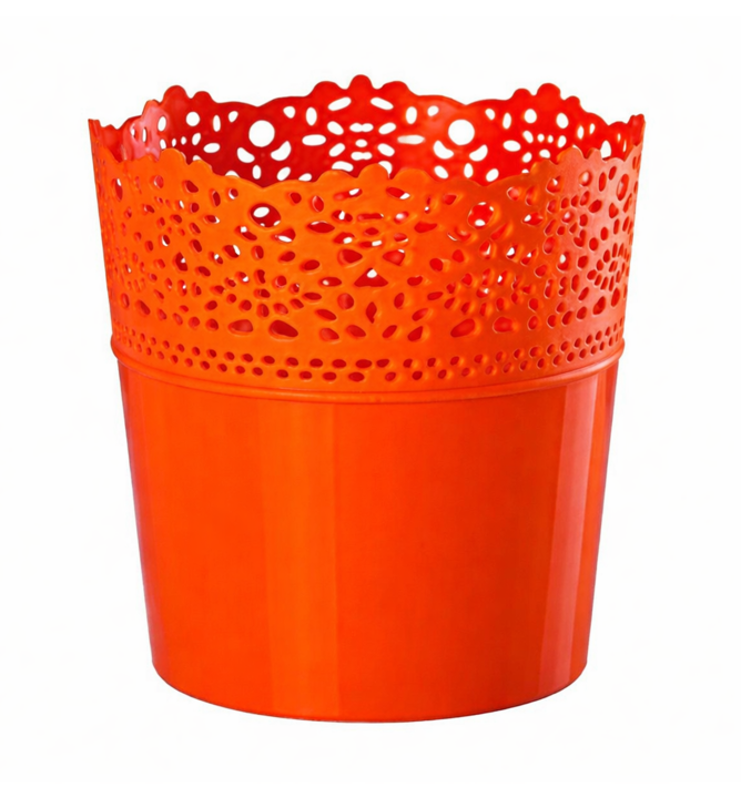 Atraktivní plastový květináč s jemným krajkovým vzorem oranžové barvy.