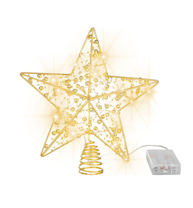 Charakteristika: Dekorativní vánoční hvězda je krásným doplňkem na vrchol vašeho vánočního stromku. Vyrobeno z odolného plastu se zlatým povrchem a jemným zdobením, díky čemuž působí elegantně a stylově. Světelný efekt zajišťuje 10 LED diod v teplé bílé barvě, které vytváří příjemnou sváteční atmosféru. Parametry produktu: