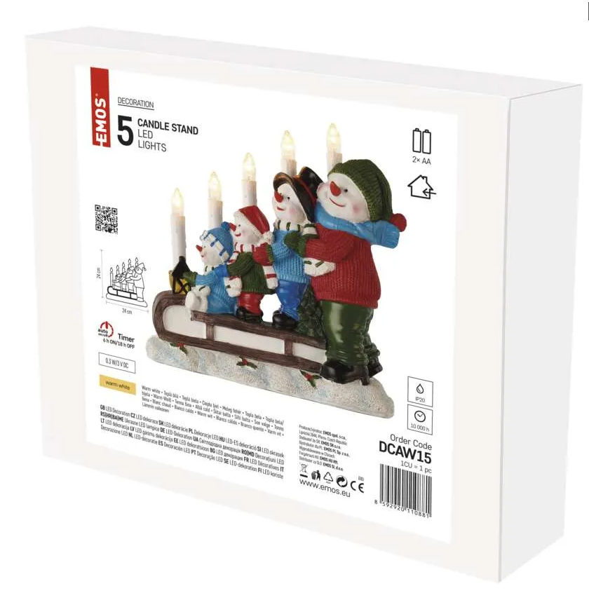- LED SVÍTNÍK sněhuláci na saních, 24 cm, 2x AA, vnitřní, teplá bílá, časovač