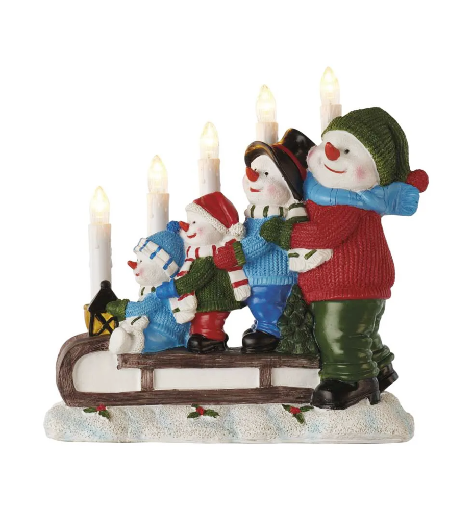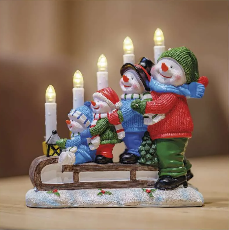 Vánoční LED svícen sněhuláci na saních s teplým bílým světlem.