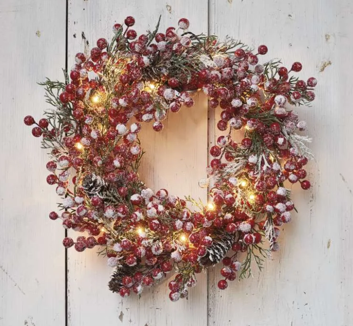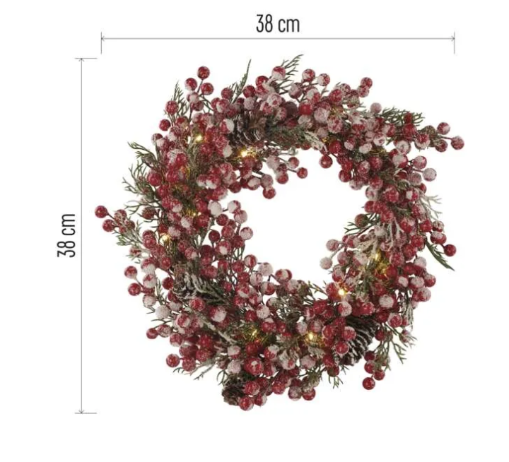 LED zdobený vánoční věnec svítí teplou bílou barvou.