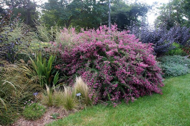 Charakteristika: Lespedéza thunbergii, běžně nazývaná jetel keřová je listnatý, polodrevnatý keř. Lespedézia se řadí do čeledi bobovité. Vyznačuje se střídavými, trojpočetnými zelenými listy s převislými růžovo-fialovými květy podobnými hrachu. Kvete koncem léta nebo začátkem podzimu, nejlépe na slunném stanovišti. Svou výraznou vůní láká motýly a množství jiného hmyzu, a proto se řadí mezi výborné opylovače. Na konci vegetačního období celá rostlina odumírá proto je vhodné nadzemní část zastřihnout.