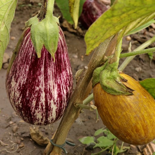Vysoce výnosná odrůda lilku s dekorativními, fialovo-bílými plody.