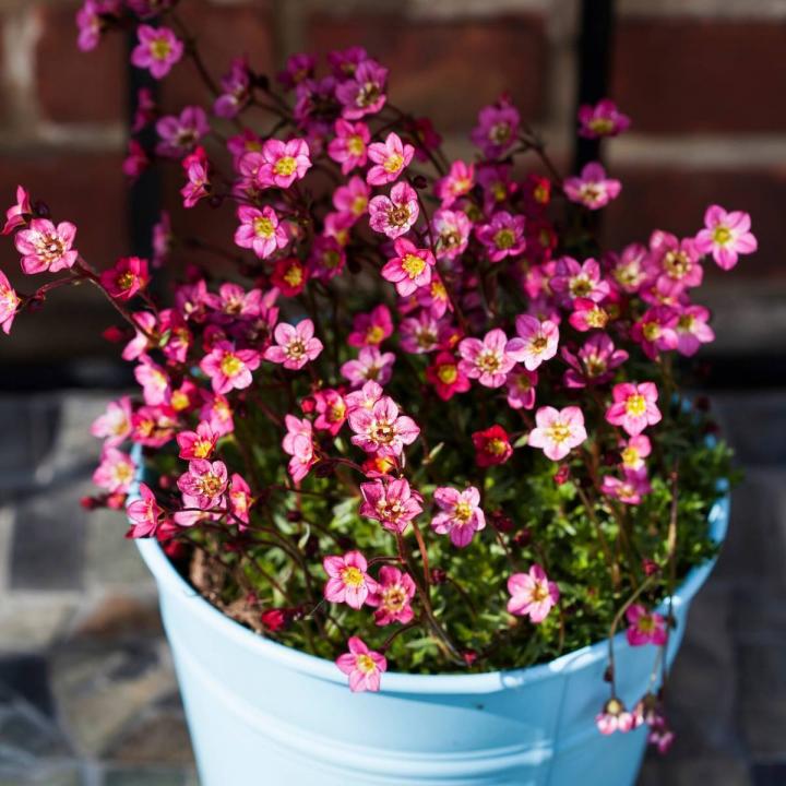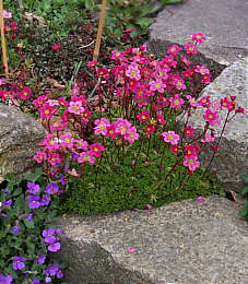 Půdopokryvná skalnička s bohatým kvetením růžově karmínových květů.