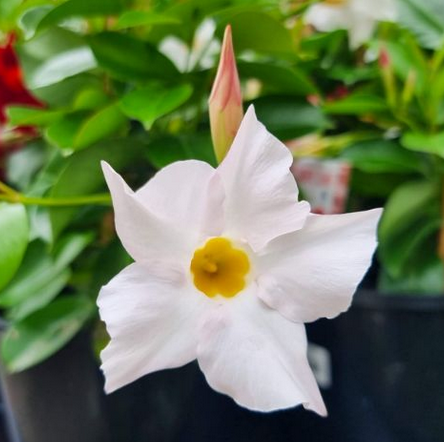 Charakteristika: Kultivar ´JADE WHITE´ okouzlí svými sněhobílé květy a žlutým středem. Tmavě zelené a velmi lesklé listy vytvářejí s květy zajímavý kontrast. Rostlina tvoří hustý, dobře stavěný trs. Mandevilla známá také pod názvem Dipladenia, je oblíbená popínavá liána, která působí nepřehlédnutelně během celé sezóny. Série JADE byla vyšlechtěna ve Francii. Pěstujeme ji na balkonech, terasách nebo v květináčích.