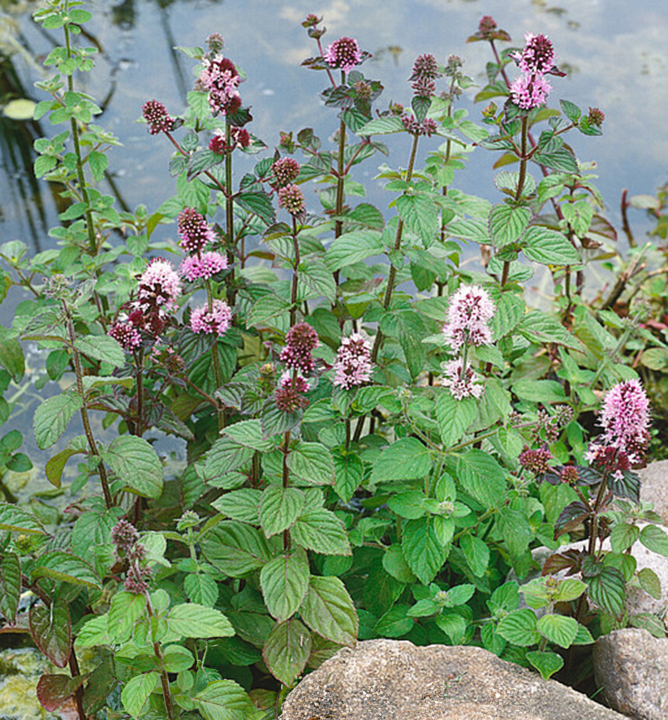 Zajímavá vodní máta se svěžími zelenými listy a fialovými květy.