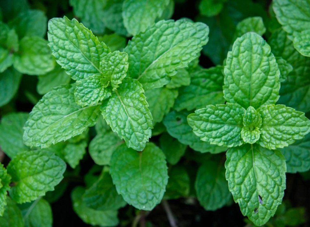 Přírodní máta s tmavě zelenými listy a stonky zbarvenými do fialova.