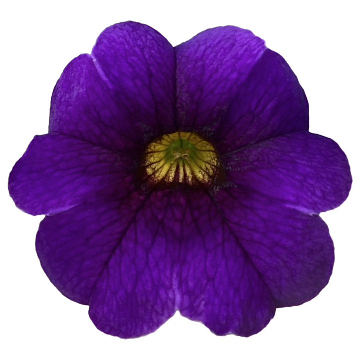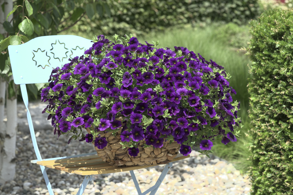 Atraktivní bohatě kvetoucí minipetúnie s fialovými květy a žlutým středem.