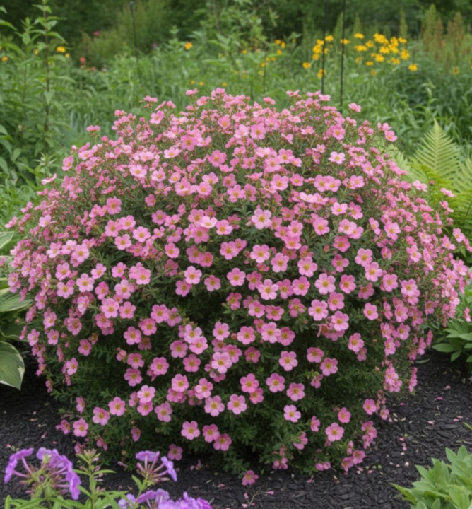 Kompaktní, bohatě kvetoucí nátržník s malými květy růžové barvy.